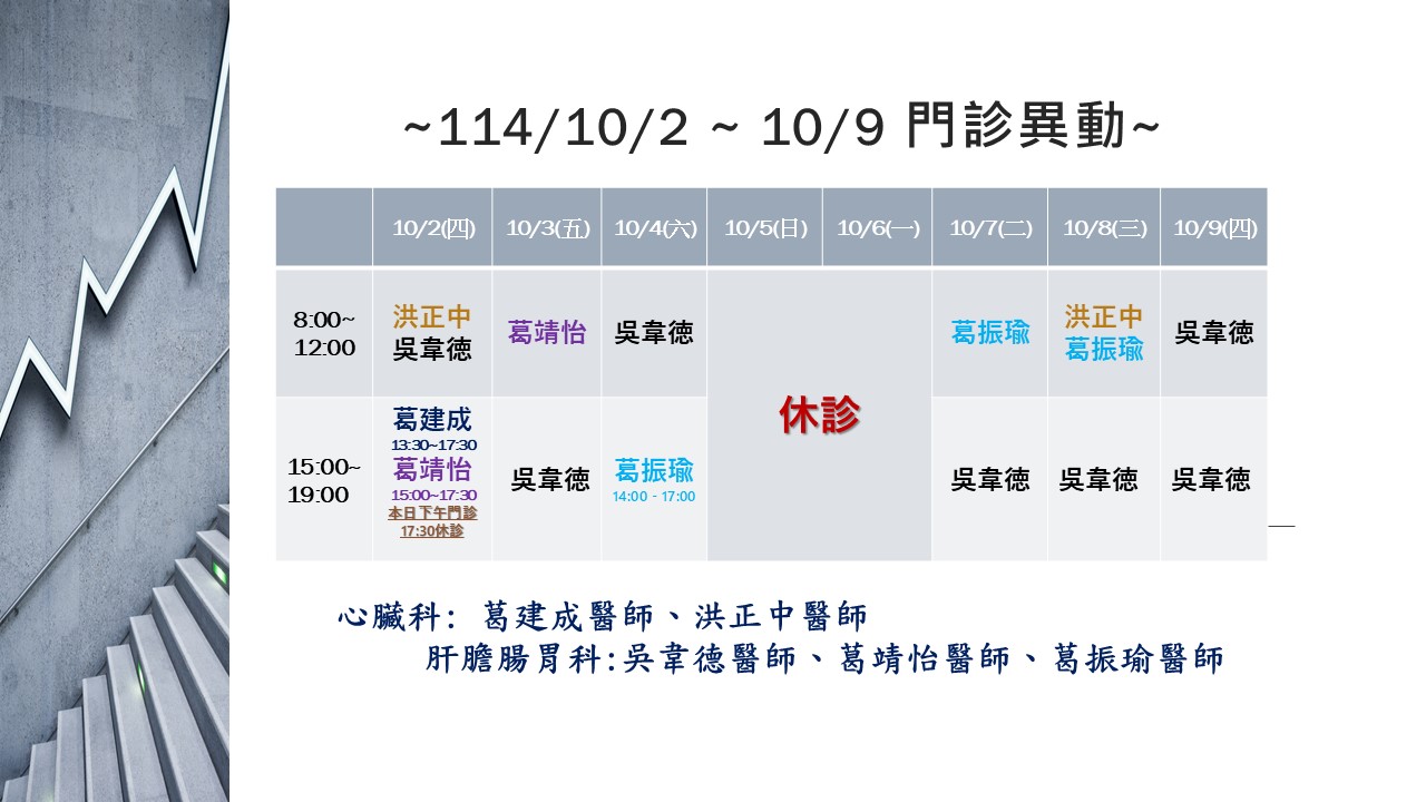 【門診異動公告】10/2(四)~10/9(四)門診異動