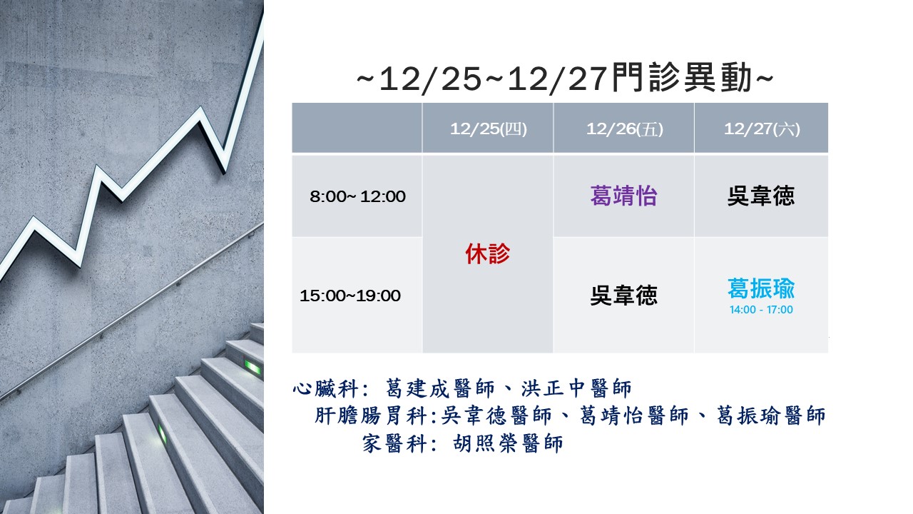 【門診異動公告】12/25(四)~12/27(六)門診異動