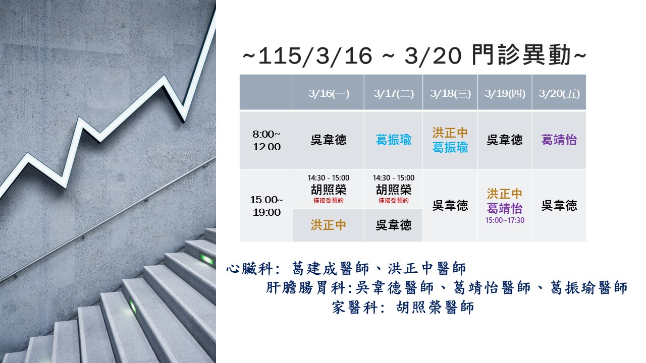【門診異動公告】115/3/16(一)~3/20(五)門診異動